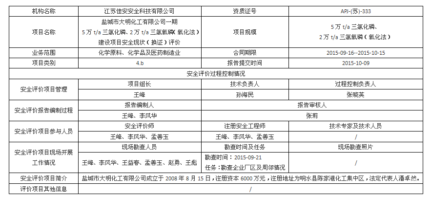 盐城市大明化工有限公司 一期5万t/a三氯化磷、2万t/a三氯氧磷(氧化法)建设项目安全现状(换证)评价