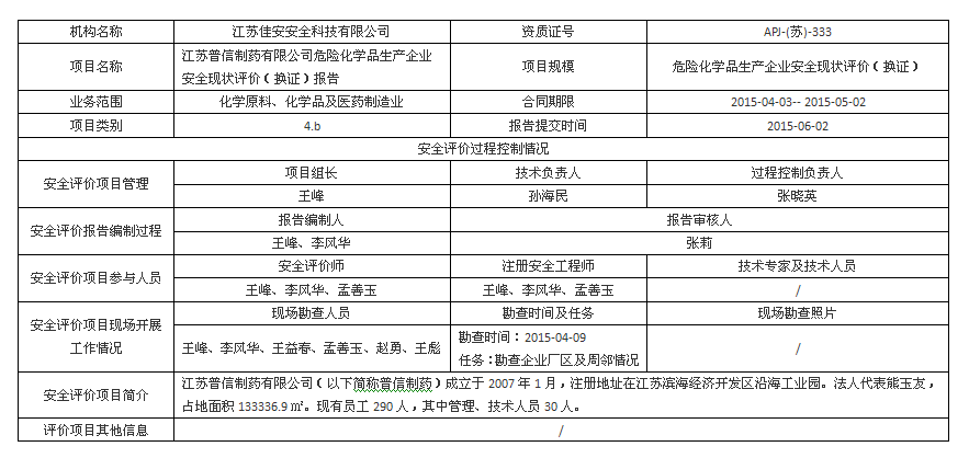 江苏普信制药有限公司 危险化学品生产企业安全现状评价(换证)报告