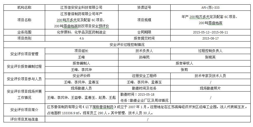 江苏普信制药有限公司 年产200吨齐多夫定原料药、200吨恩曲他滨技改项目安全设施验收评价