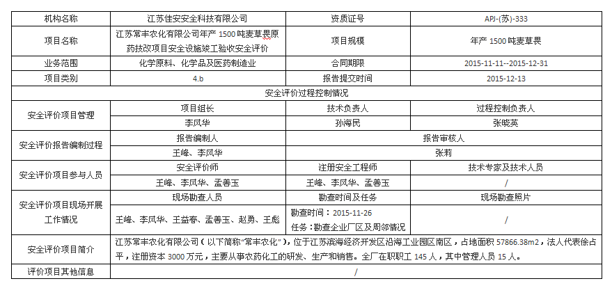 江苏常丰农化有限公司 年产1500吨麦草畏原药技改项目安全设施竣工验收安全评价