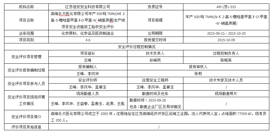 滨海永太医化有限公司 年产500吨TMNI[N-(2-氯-5-噻唑基甲基)-O-甲基-N’-硝基异脲]生产线项目安全设施