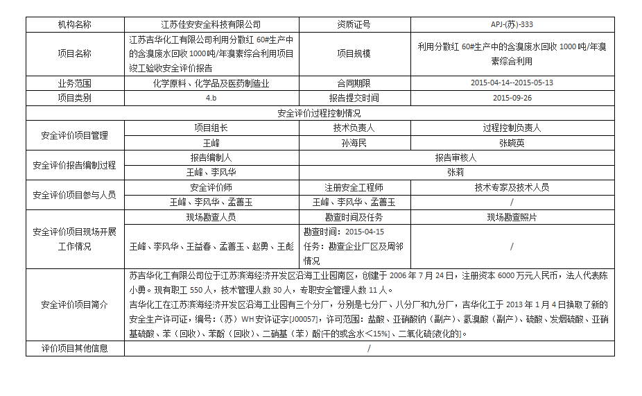 江苏吉华化工有限公司 利用分散红60#生产中的含溴废水回收1000吨/年溴素综合利用项目竣工验收安全评价报告