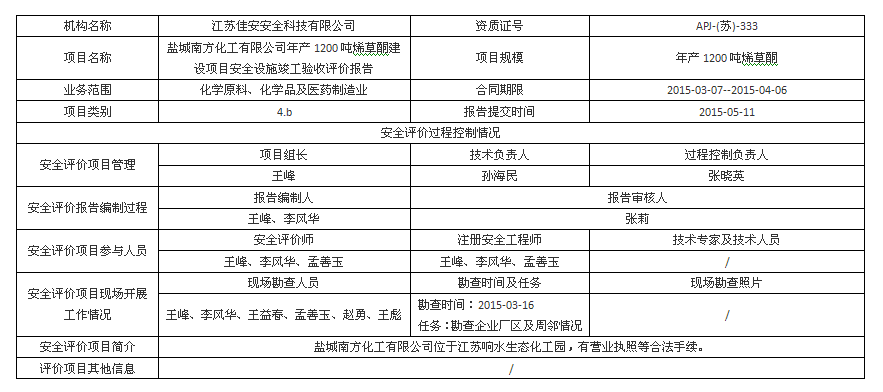 盐城南方化工有限公司 年产1200吨烯草酮建设项目安全设施竣工验收评价报告