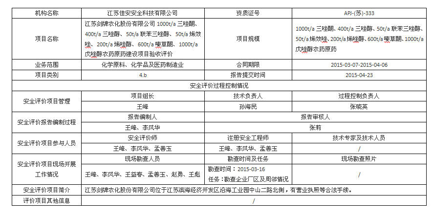 江苏剑牌农业化工有限公司 1000t/a三唑酮、400t/a三唑醇、50t/a联苯三唑醇、50t/a烯效唑、200t/a