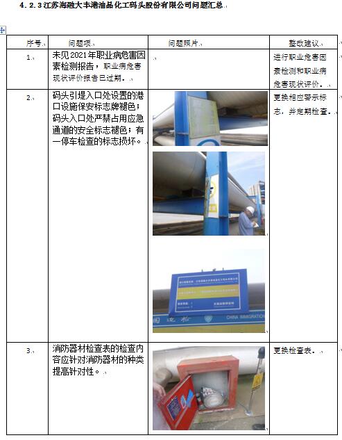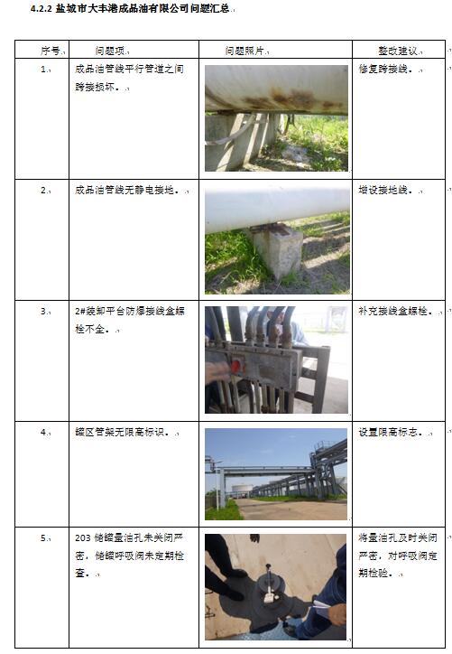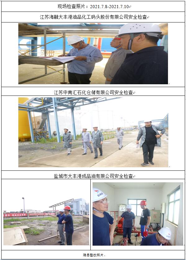 1 | 江苏中南汇石化仓储有限公司、江苏海融大丰港油品化工码头股份有限公司、盐城市大丰港成品油有限公司安全检查报告 | 2021.7 | ||